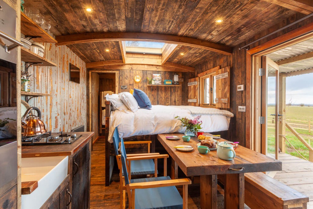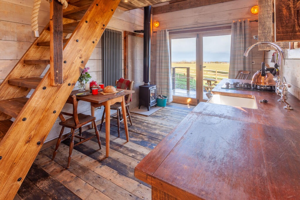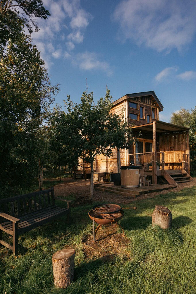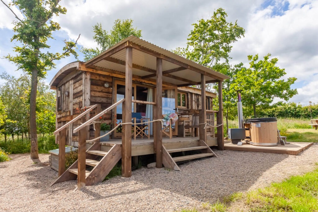 Set within natural woodland on our Northumberland farm, we have four individual luxury Shepherd’s Huts & Cabins, all with king size beds and ensuite bathrooms. Outside each hut or cabin have their own decking with a private wood-fired hot tub and fire pit. The huts, nestled among the trees, overlook a wildflower meadow and have stunning views of the Northumbrian coast.