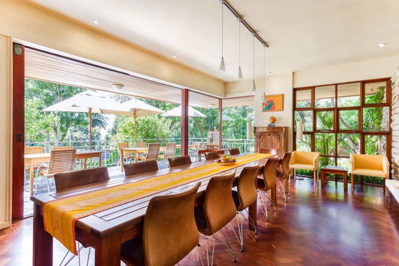 Our house nestled in a 1840 sqm property with a big pool, 14 old palm trees and plenty of other trees and greenery. We have 6 rooms in the main house and one guest room in a timber house on the slopes of the property.”